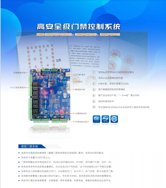 • 国密四级认证门禁系统 - 符合国家密码管理局标准,确保访问安全